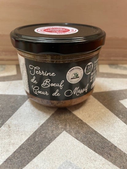 Ingrédients : Viande et foie de boeuf 52% (Origine France : Ferme Pierrat), viande et gras de porc (origine France), Coeur de Massif (Origine France : Ferme de la Chapelle des Vés) : lait, sel, présure, ferments lactiques)), oignons, crème, oeufs, gélatine, sel fin, alcool (sulfites), poivre et aromates.