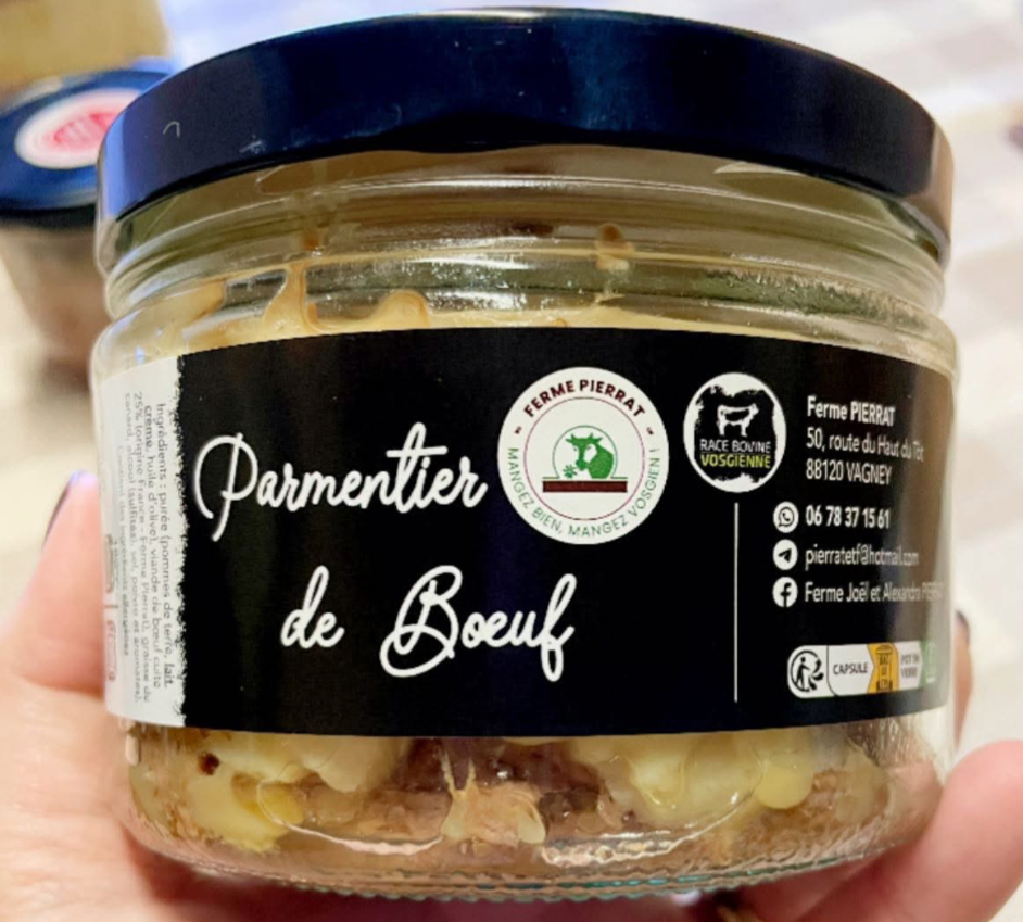 Ingrédients : Purée de pomme de terre, lait, crème, huile d'olive, viande de boeuf cuite 25% (origine : Ferme Pierrat), graisse de canard, alcool (sulfites), sel, poivre, aromates.